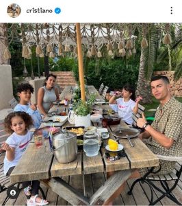 Cristiano Ronaldo dan pasangannya, Georgina Rodriguez beserta anak-anak mereka naik jet pribadi menuju ke rumah liburan mereka di Mallorca, sebuah pulau di negara Spanyol. Pemain veteran Manchester United memposting fotonya dengan keluarga kesayangannya yang berkumpul di meja makan sambil bersantai bersama di cuaca yang cerah dan sejuk.